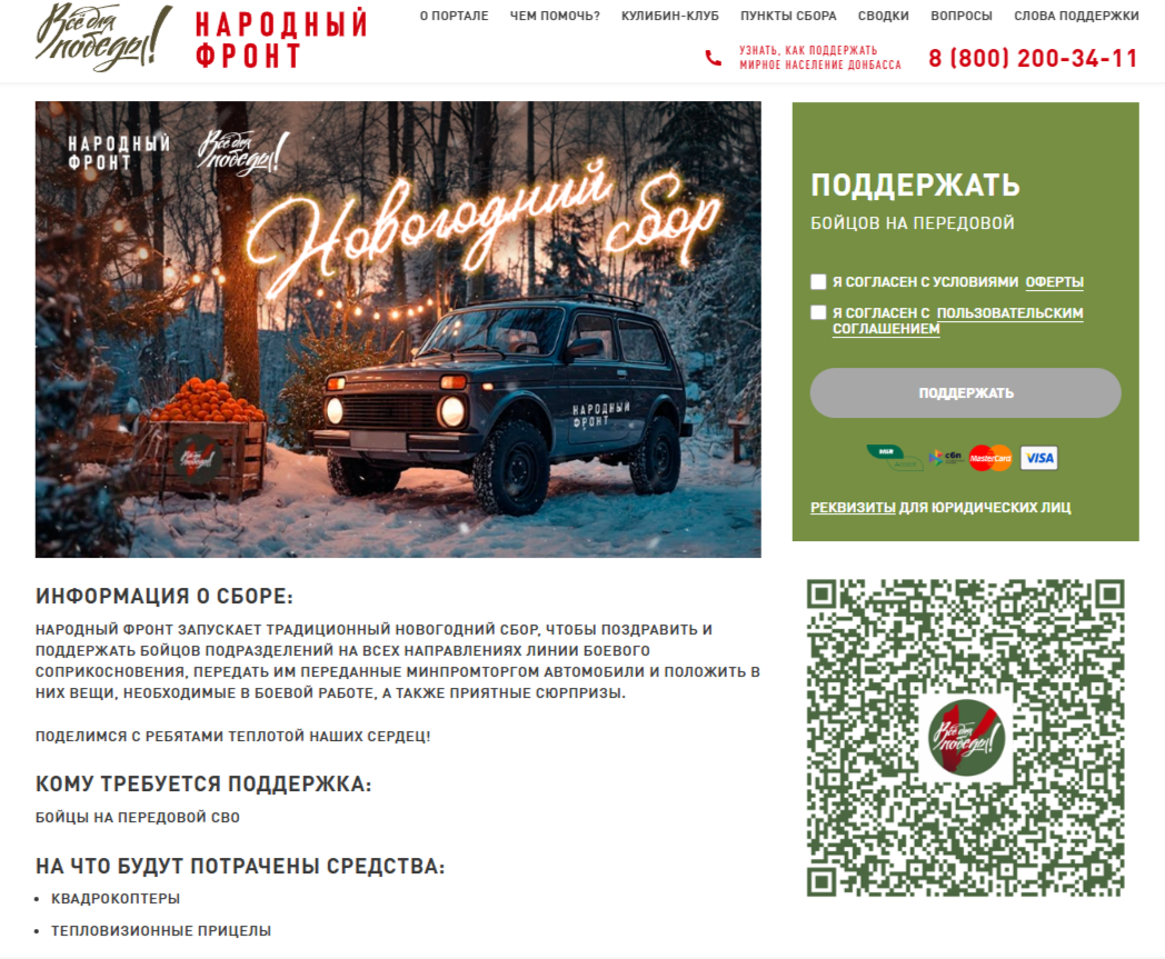 В преддверии Нового года «Народный фронт» запустил традиционный новогодний сбор, чтобы поздравить и поддержать бойцов подразделений на всех направлениях линии боевого соприкосновения, передать им переданные Минпромторгом автомобили и положить в них вещи, необходимые в боевой работе, а также приятные сюрпризы.