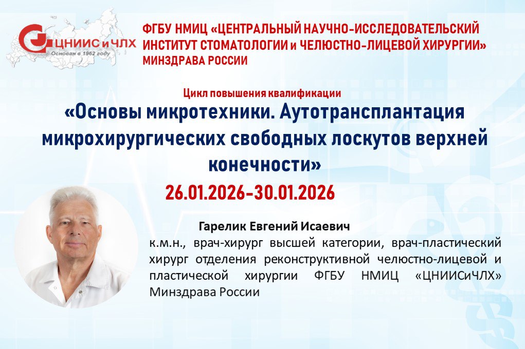 С 26 по 30 января 2026 года пройдет цикл повышения квалификации по челюстно-лицевой хирургии для практикующих врачей по теме: «Основы микротехники. Аутотрансплантация микрохирургических свободных лоскутов верхней конечности»