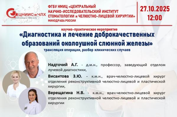 ФГБУ НМИЦ «ЦНИИСиЧЛХ» Минздрава России приглашает Вас принять участие в научно-практическом мероприятии на тему: «Диагностика и лечение доброкачественных образований околоушной слюнной железы», которое состоится 27 октября 2025 года в 12:00 (МСК).