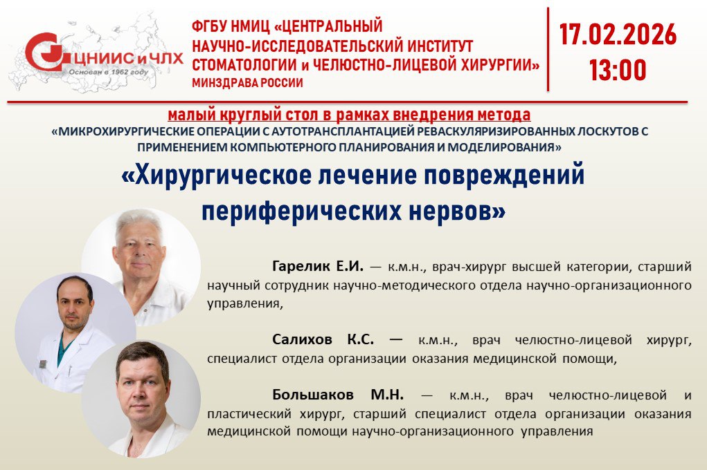 Приглашаем Вас 17 февраля 2026 года в 13:00 на научно-практическое онлайн-мероприятие в формате малого круглого стола на тему: «Хирургическое лечение повреждений периферических нервов»,докладчики Гарелик Е.И. — к.м.н., врач-хирург высшей категории, старший научный сотрудник научно-методического отдела научно- организационного управления ФГБУ НМИЦ «ЦНИИСиЧЛХ» Минздрава России, Салихов К.С. — к.м.н., врач-челюстно-лицевой хирург, специалист отдела организации оказания медицинской помощи научно-организационного управления ФГБУ НМИЦ «ЦНИИСиЧЛХ» Минздрава России, Большаков М.Н. - к.м.н., врач челюстно-лицевой и пластический хирург, старший специалист отдела организации оказания медицинской помощи научно-организационного управления ФГБУ НМИЦ «ЦНИИСиЧЛХ» Минздрава России;