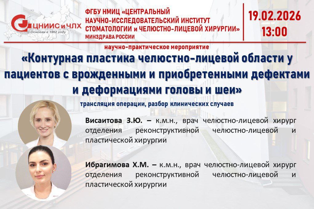 Приглашаем 19 февраля 2026 года в 13:00 на вебинар на тему: «Контурная пластика челюстно-лицевой области у пациентов с врожденными и приобретенными дефектами и деформациями головы и шеи» (к.м.н. Висаитова З.Ю., к.м.н. Ибрагимова Х.М.).