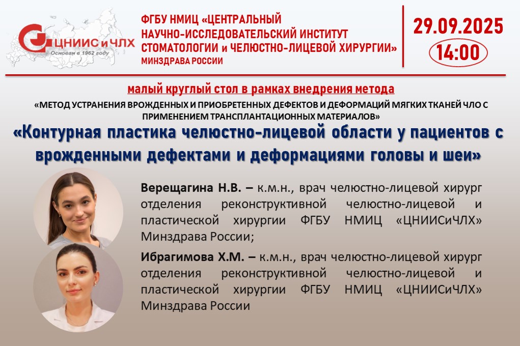 В рамках внедрения методов профилактики, диагностики, лечения и реабилитации в челюстно-лицевой хирургии приглашаем 29 сентября 2025 года в 14:00 на научно-практическое онлайн-мероприятие в формате круглого стола на тему: «Контурная пластика челюстно-лицевой области у пациентов с врождёнными дефектами и деформациями головы и шеи», докладчики Верещагина Н.В. — к.м.н., врач-челюстно-лицевой хирург отделения реконструктивной челюстно-лицевой и пластической хирургии ФГБУ НМИЦ «ЦНИИСиЧЛХ» Минздрава России; Ибрагимова Х.М. — к.м.н., врач-челюстно-лицевой хирург отделения реконструктивной челюстно-лицевой и пластической хирургии ФГБУ НМИЦ «ЦНИИСиЧЛХ» Минздрава России.