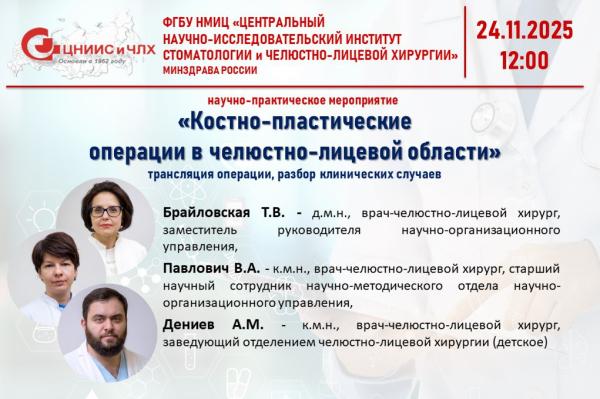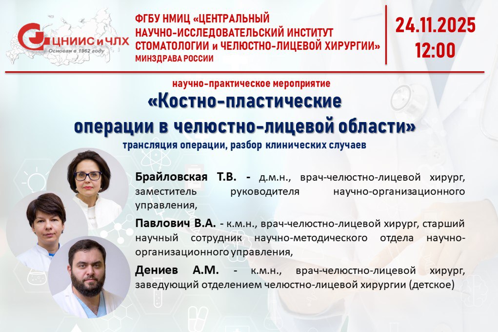 24 ноября 2025 года в 12:00 состоится вебинар на тему: «Костно-пластические операции в челюстно-лицевой области», докладчики Брайловская Т.В. — д.м.н., врач-челюстно-лицевой хирург, заместитель руководителя научно-организационного управления, Павлович В.А. — к.м.н., врач-челюстно-лицевой хирург, старший научный сотрудник научно-методического отдела научно-организационного управления, Дениев А.М. — к.м.н., врач-челюстно-лицевой хирург, заведующий отделением челюстно-лицевой хирургии(детское). В рамках вебинара планируется разбор клинических случаев.