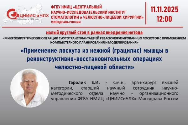 В рамках внедрения методов профилактики, диагностики, лечения и реабилитации в челюстно-лицевой хирургии приглашаем 11 ноября 2025 года в 12:00 состоится научно-практическое онлайн-мероприятие в формате круглого стола на тему: «Применение лоскута из нежной (грацилис) мышцы в реконструктивно-восстановительных операциях челюстно-лицевой области», докладчик Гарелик Е.И. — к.м.н., врач-хирург высшей категории, старший научный сотрудник научно-методического отдела научно-организационного управления ФГБУ НМИЦ «ЦНИИСиЧЛХ» Минздрава России.