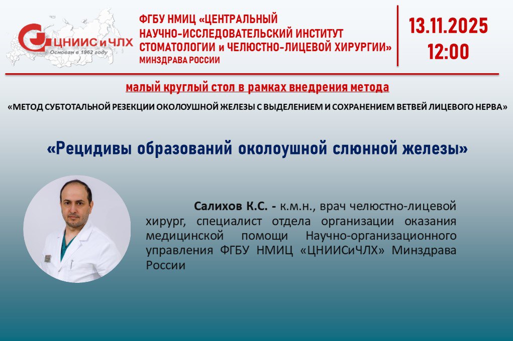 В рамках внедрения методов профилактики, диагностики, лечения и реабилитации в челюстно-лицевой хирургии приглашаем 13 ноября 2025 года в 12:00 на научно-практическое онлайн-мероприятие в формате круглого стола на тему: «Рецидивы образований околоушной слюнной железы» докладчик Салихов К.С. — к.м.н., врач-челюстно-лицевой хирург, специалист отдела организации оказания медицинской помощи научно-организационного управления ФГБУ НМИЦ «ЦНИИСиЧЛХ» Минздрава России.