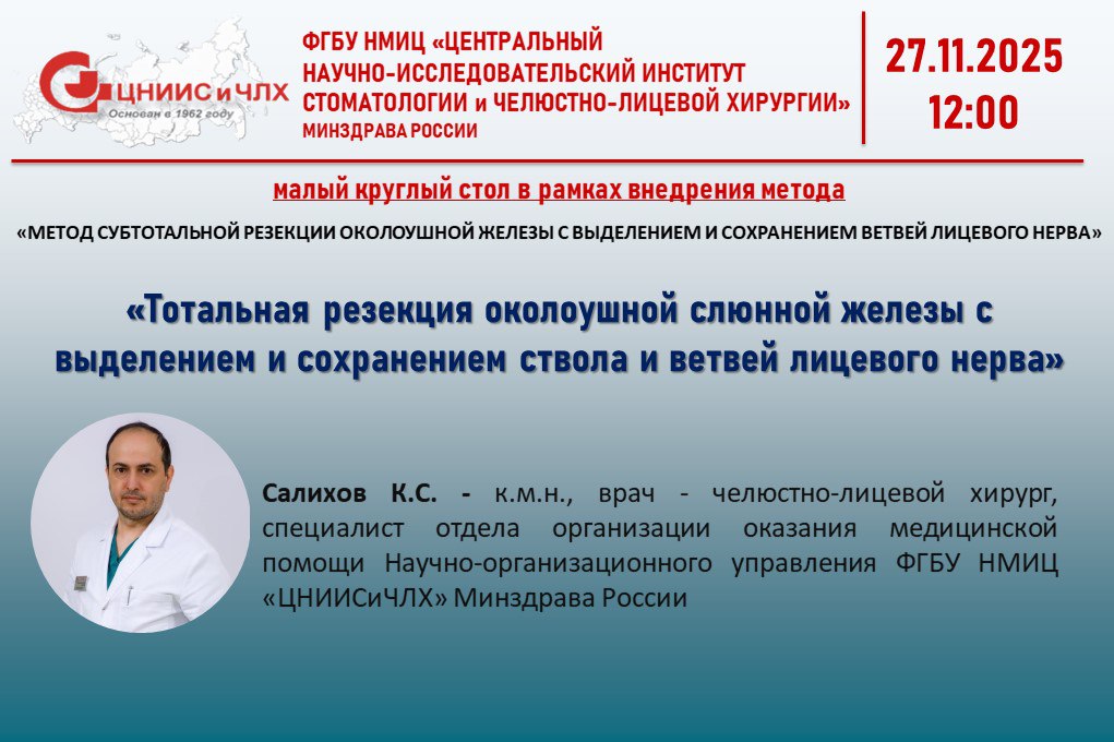 В рамках внедрения методов профилактики, диагностики, лечения и реабилитации в челюстно-лицевой хирургии приглашаем 27 ноября 2025 года в 12:00 на научно-практическое онлайн-мероприятие в формате круглого стола на тему: «Тотальная резекция околоушной слюнной железы с выделением и сохранением ствола и ветвей лицевого нерва» докладчик Салихов К.С. — к.м.н., врач-челюстно-лицевой хирург, специалист отдела организации оказания медицинской помощи научно-организационного управления ФГБУ НМИЦ «ЦНИИСиЧЛХ» Минздрава России.