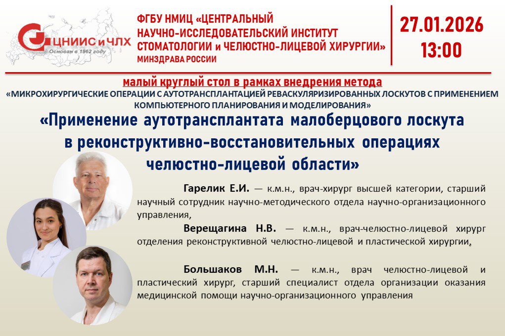 Продолжаем работу в рамках внедрения методов профилактики, диагностики, лечения и реабилитации по профилю «челюстно-лицевая хирургия» и приглашаем на вебинар 27 января 2026 года в 13:00 на тему: «Применение аутотрансплантата малоберцового лоскута в реконструктивно - восстановительных операциях челюстно-лицевой области», докладчики Гарелик Е.И. — к.м.н., врач-хирург высшей категории, Верещагина Н.В. — к.м.н., врач-челюстно-лицевой хирург отделения реконструктивной челюстно-лицевой и пластической хирургии, Большаков М.Н. - к.м.н., врач челюстно-лицевой и пластический хирург.